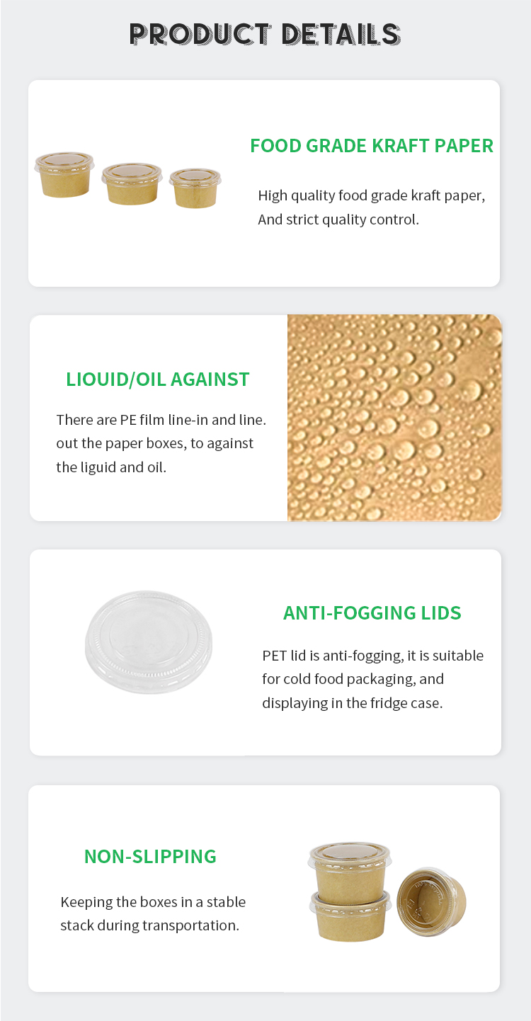 ► LIQUID/Oil AGAINST – There are PE film line-in and -out the paper bowls, to against the liquid and oil.
